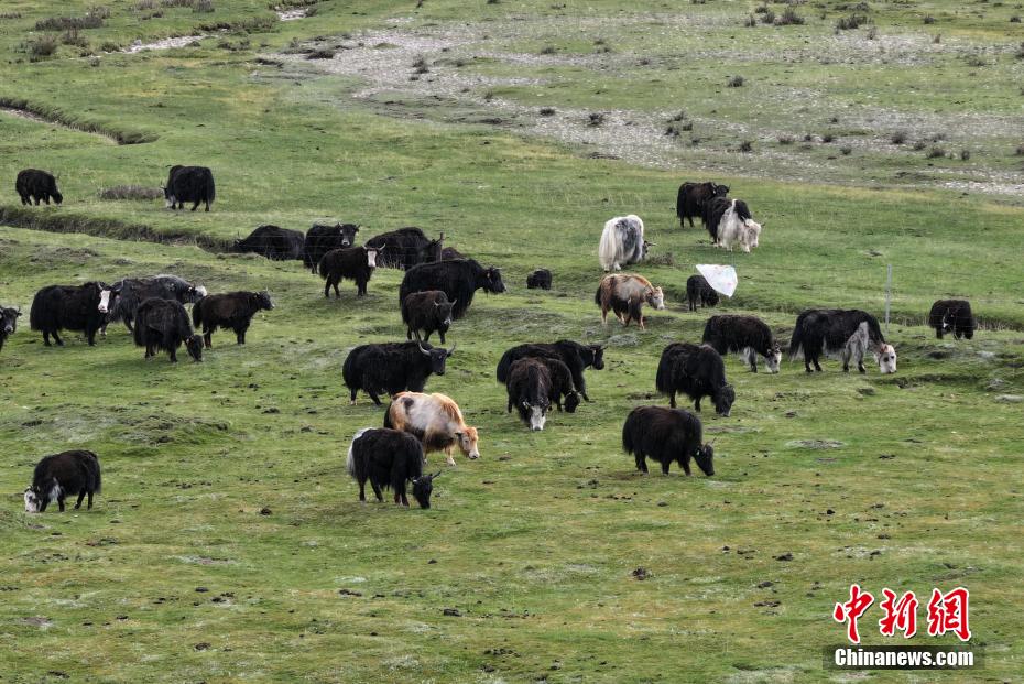 6月4日,航拍青海省海北藏族自治州剛察縣草原上,成群牦牛正在覓食。(無人機(jī)照片)馬銘言 攝