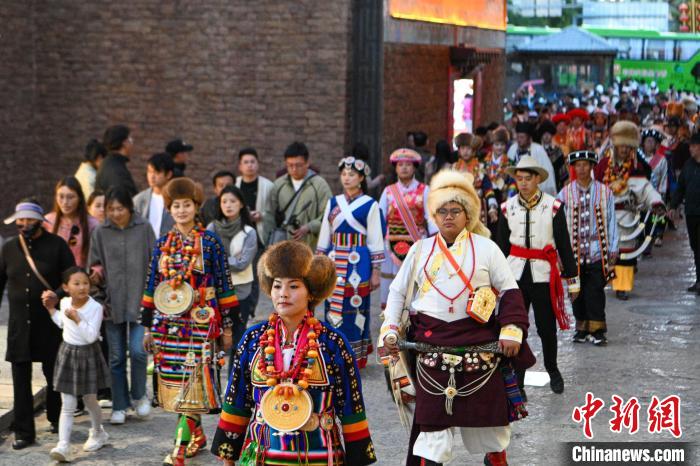 6月9日,模特在獨(dú)克宗古城內(nèi)巡游展示民族服飾。李嘉嫻 攝