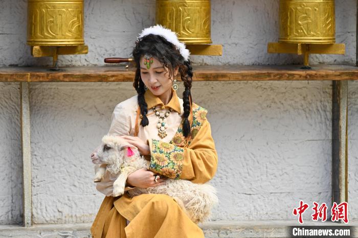 6月10日,游客身著富有民族風(fēng)情的服飾撫摸懷中小羊。李嘉嫻 攝