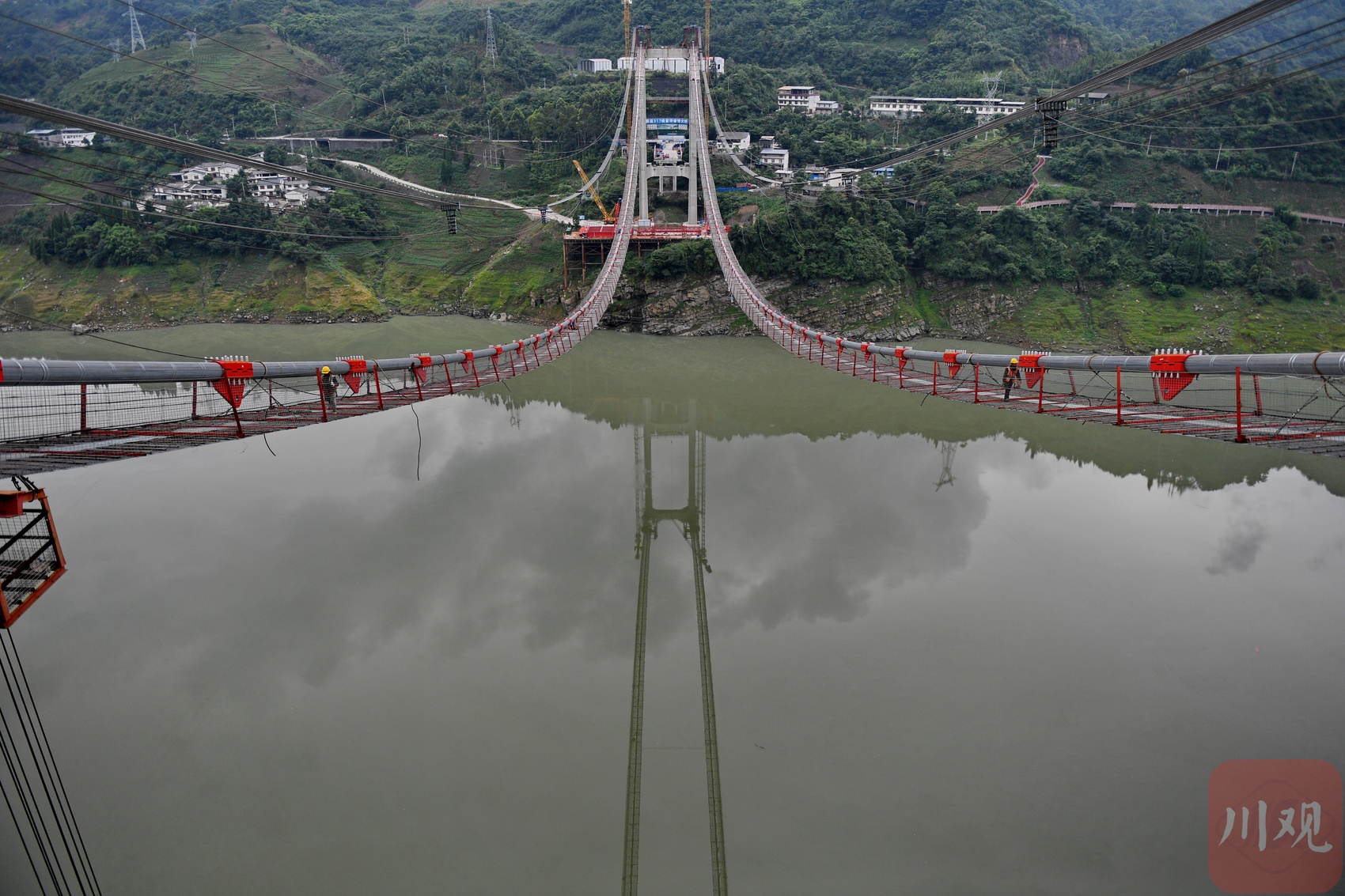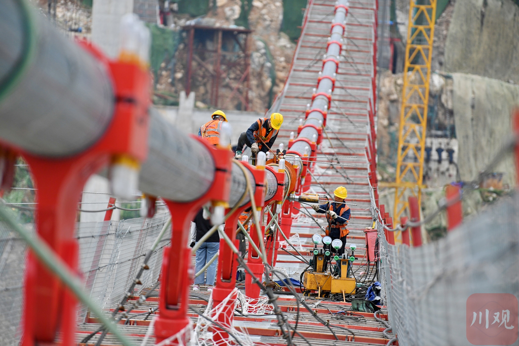 汶川縣境內(nèi)的國道317線友誼隧道至映秀段改建工程現(xiàn)場,施工人員在懸索橋主纜上作業(yè)。李向雨 攝