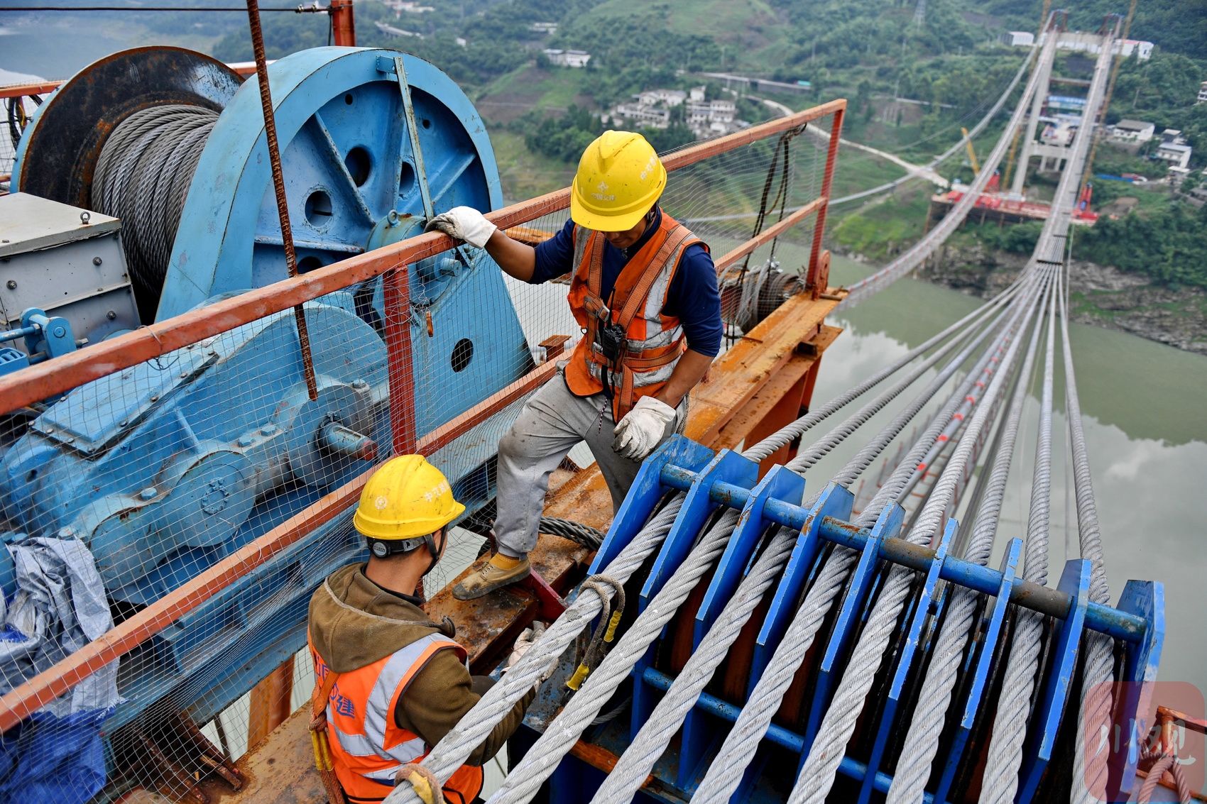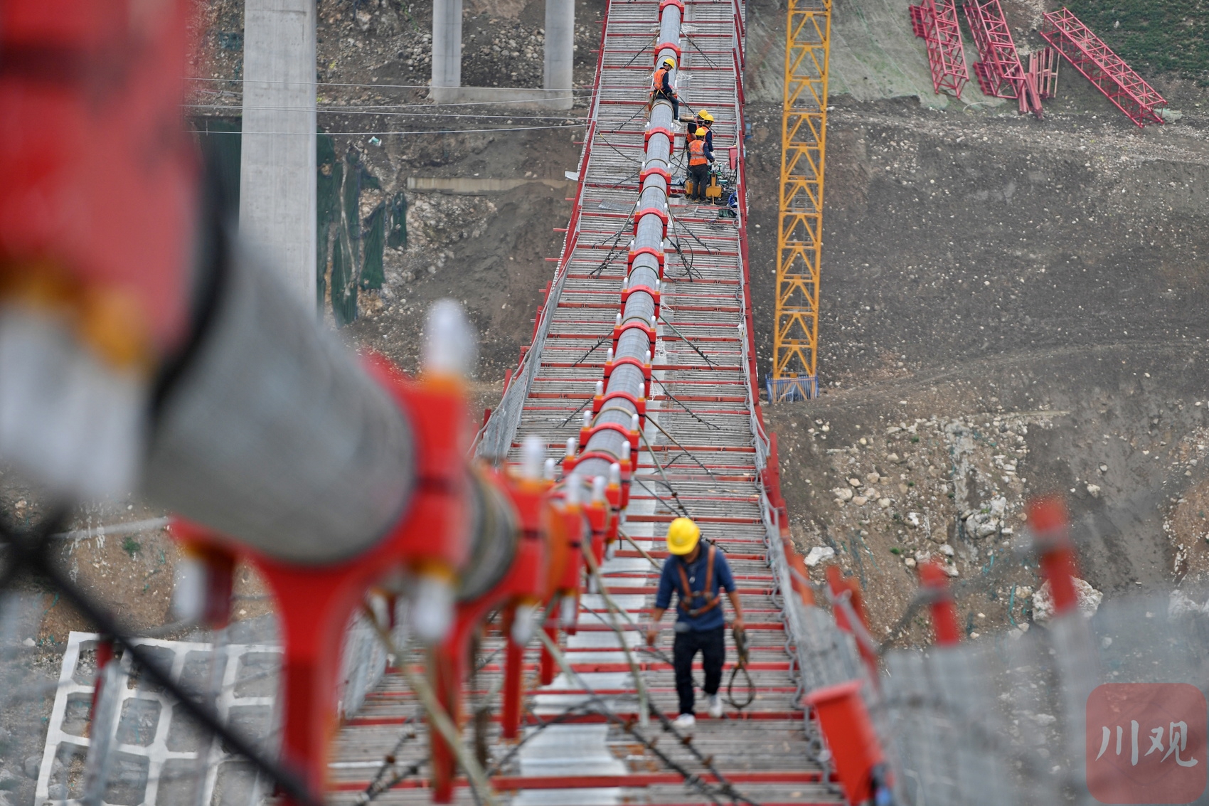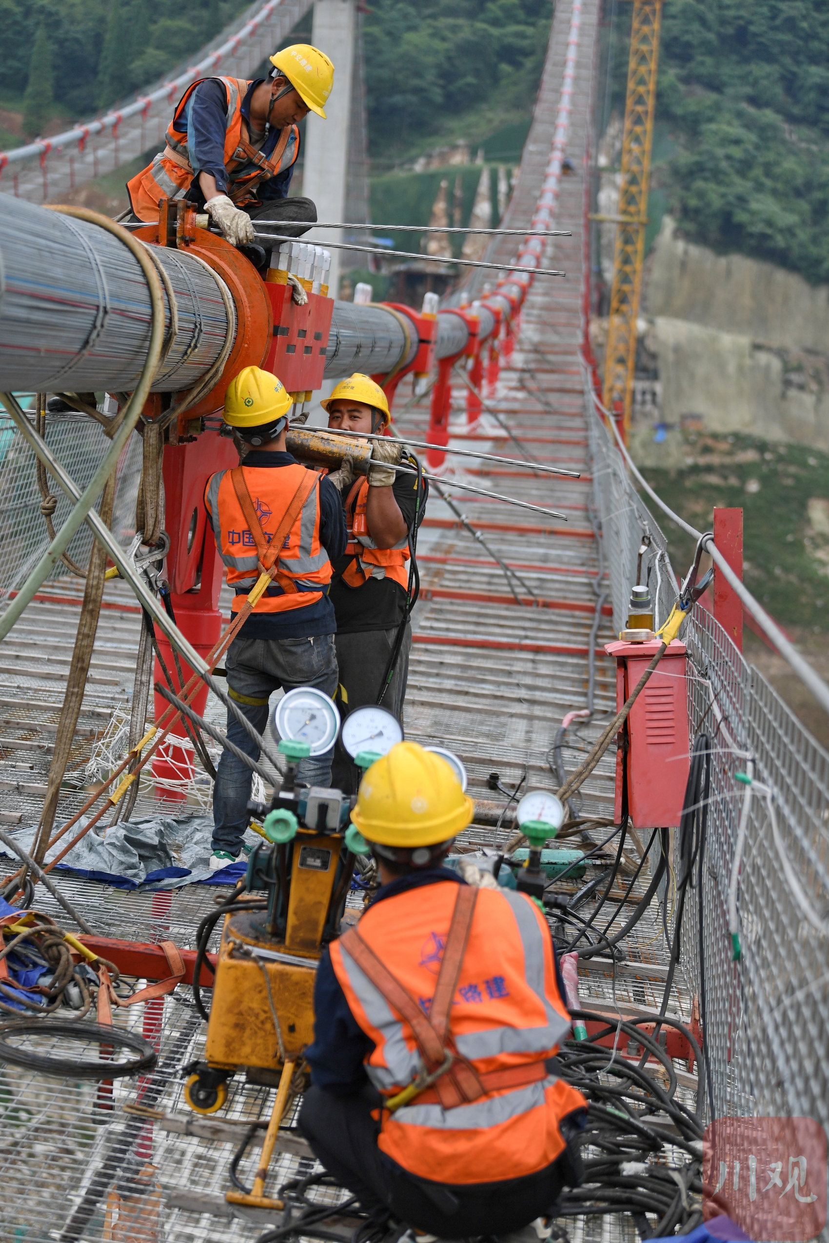 工人在懸索橋主纜上作業(yè)。
