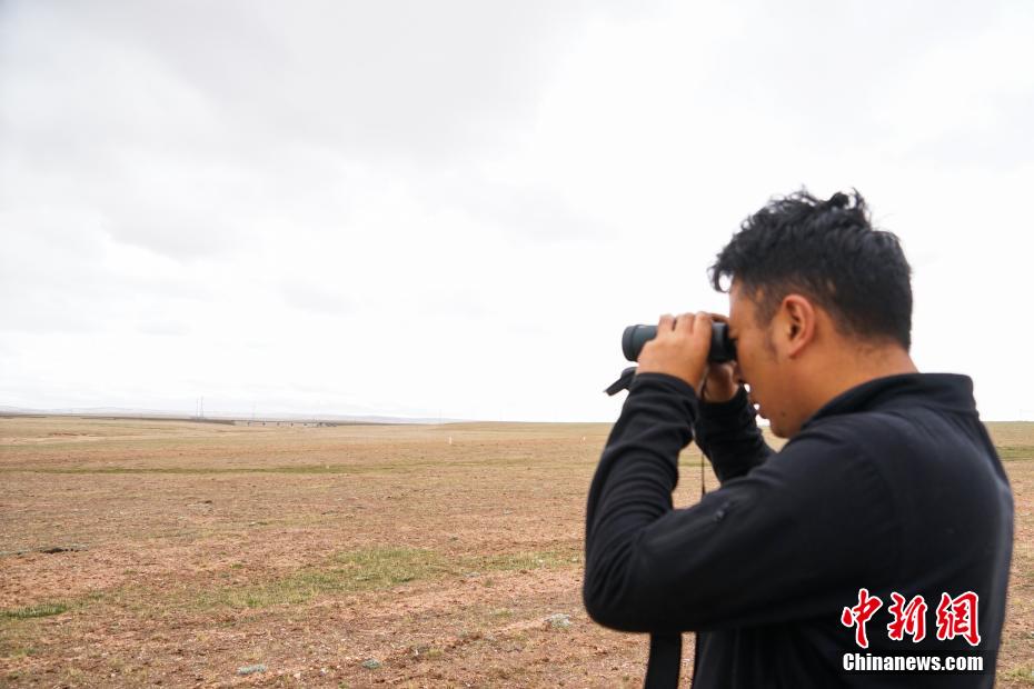 6月20日,三江源國家公園長江源園區(qū)可可西里管理處五道梁保護(hù)站附近,生態(tài)管護(hù)員德尕利用望遠(yuǎn)鏡在藏羚羊重要遷徙通道——五北大橋附近察看是否有藏羚羊。中新社記者 馬銘言 攝