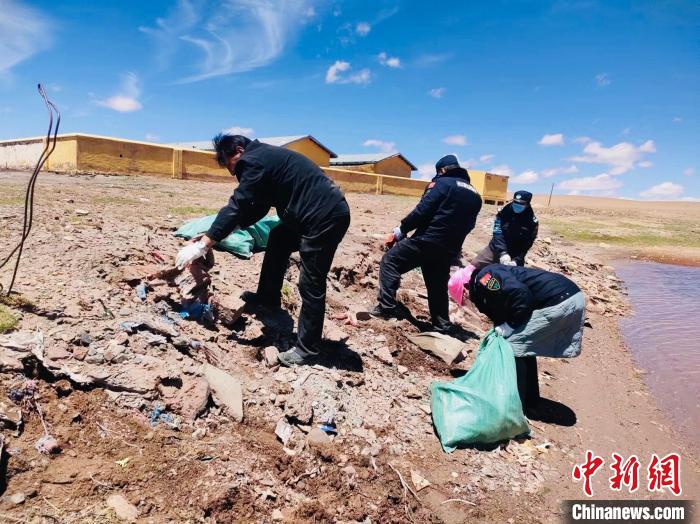 圖為長江源村生態(tài)管護員巡護時撿拾垃圾。青海省海西州格爾木市委組織部供圖