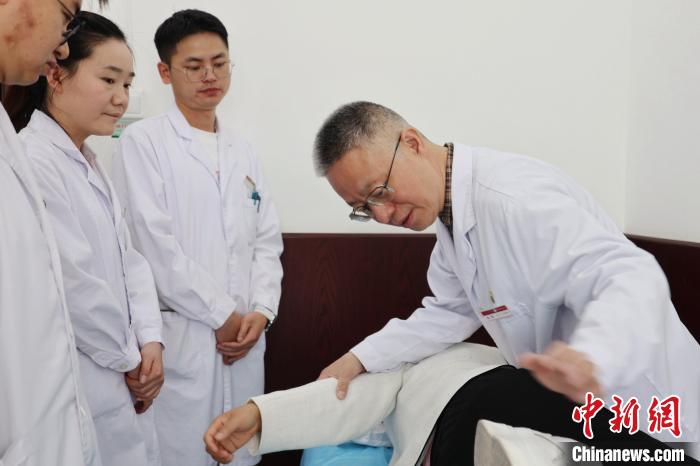 資料圖為上海援青專家、青海省中醫(yī)院院長林勛(右)示范帶教。張?zhí)砀?攝