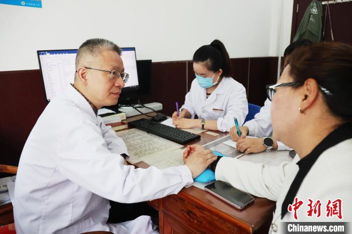 資料圖為上海援青專家、青海省中醫(yī)院院長林勛(左)在工作室問診。張?zhí)砀?攝