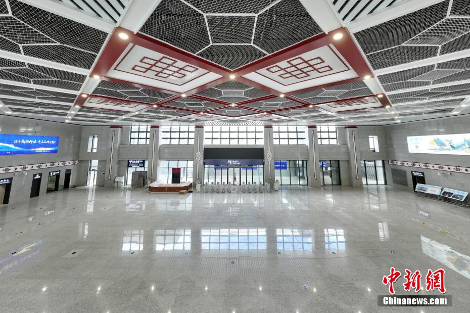 圖為7月7日拍攝的川青鐵路松潘站候車(chē)大廳,屋頂?shù)摹爸袊?guó)結(jié)”和菱形網(wǎng)板造型別具一格。(無(wú)人機(jī)照片)中新社記者 劉忠俊 攝