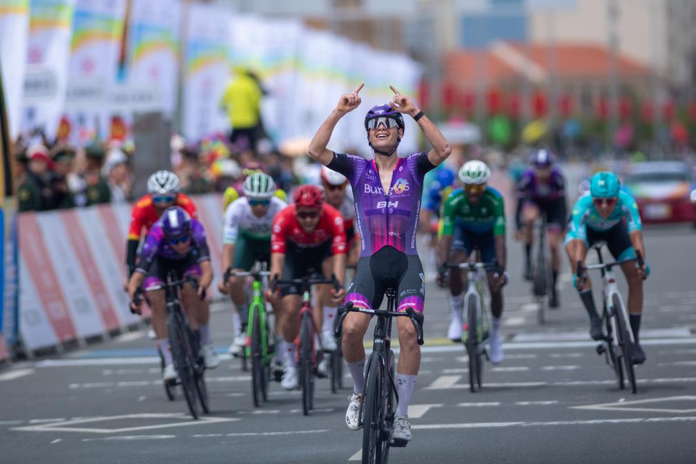 7月14日,西班牙布爾戈斯BH車隊車手法貢德斯(前)在沖過終點線后慶祝。新華社 潘彬彬 攝