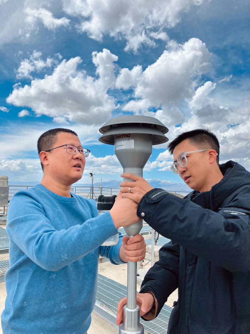 在中國大氣本底基準觀象臺(瓦里關全球大氣本底站),觀測業(yè)務負責人王寧章(左)和觀測員任磊(右)正在進行設備維護(2024年5月13日攝) 屈辰攝