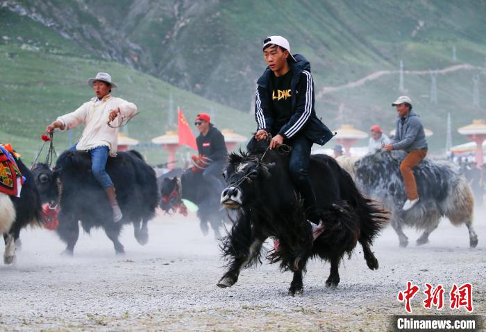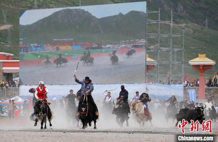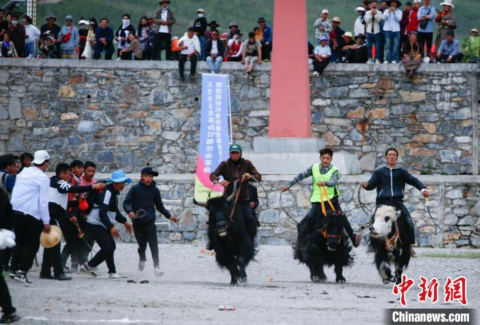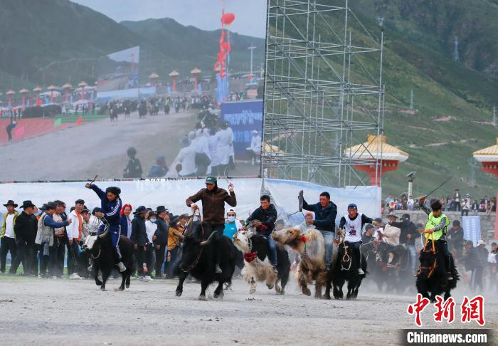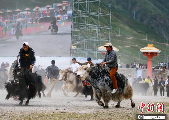 圖為參賽選手進(jìn)行牦牛競(jìng)賽。中新社記者 馬銘言 攝