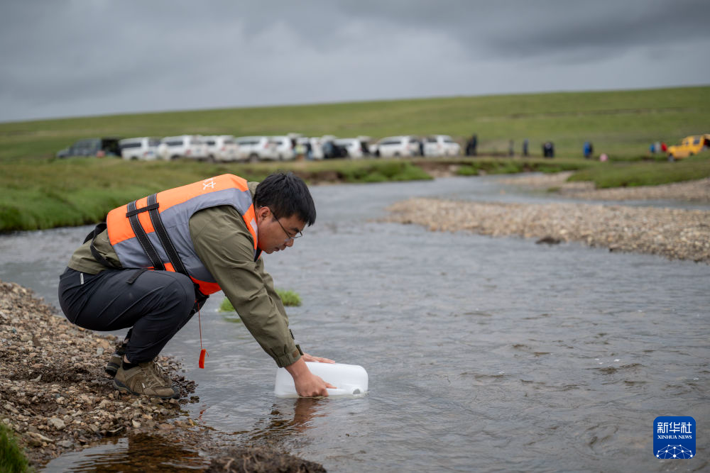 7月22日,科考隊員在當(dāng)曲源進(jìn)行水樣采集工作。新華社記者 陳杰 攝