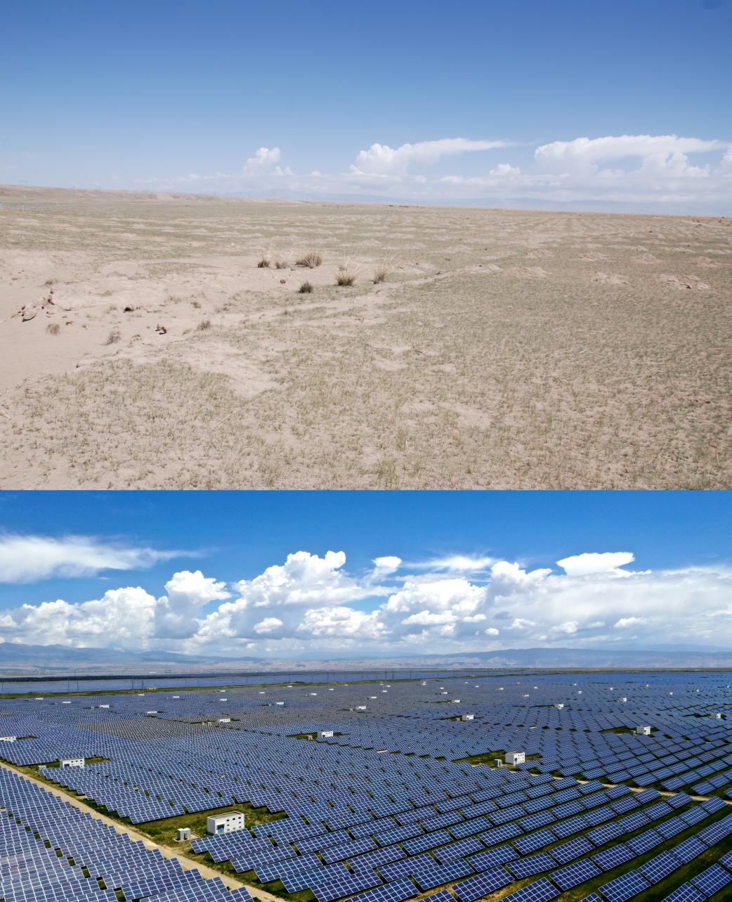 如今,荒蕪之地發(fā)展起“風(fēng)光”產(chǎn)業(yè),一改過去貧瘠荒涼的模樣。站在塔拉灘的瞭望塔上放眼望去,一望無際的光伏板向陽而立,汲取著太陽光,源源不斷釋放出綠色能源。