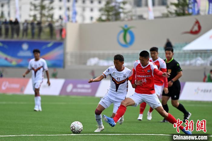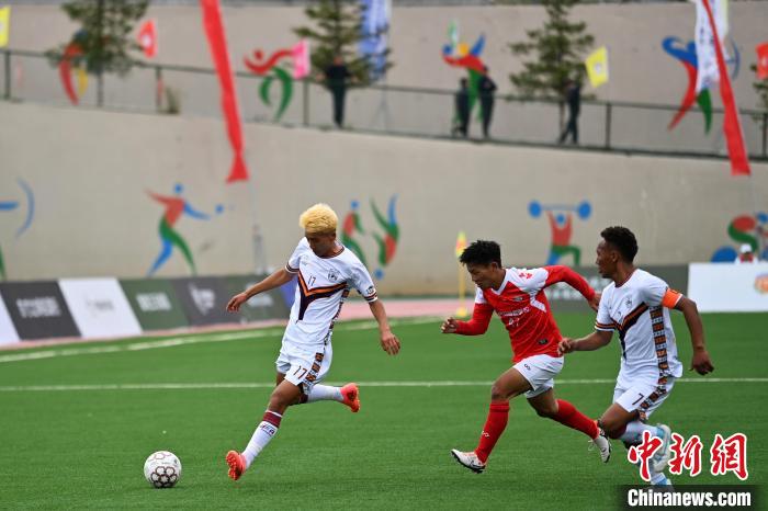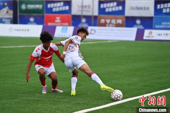 8月2日,甘肅甘南州隊球員(白)和云南迪慶州隊球員在比賽中。中新社記者 九美旦增 攝