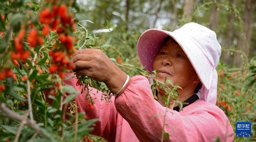 8月7日,在德令哈市,采摘工人采摘成熟枸杞。新華社 潘彬彬 攝