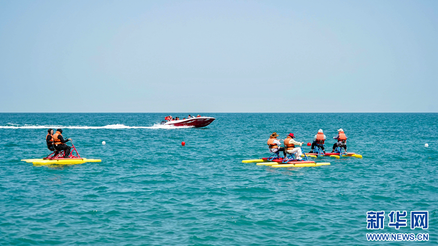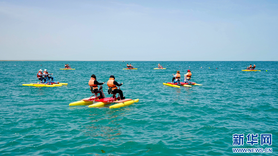 游客在青海湖青海湖景區(qū)體驗游樂項目。新華網(wǎng) 宋忠勇 攝