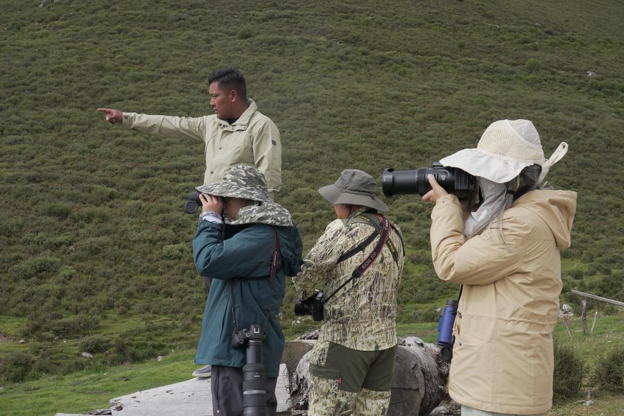 8月23日,在牧民向導(后)的帶領下,自然觀察者正在拍攝。新華社記者 柳澤興 攝