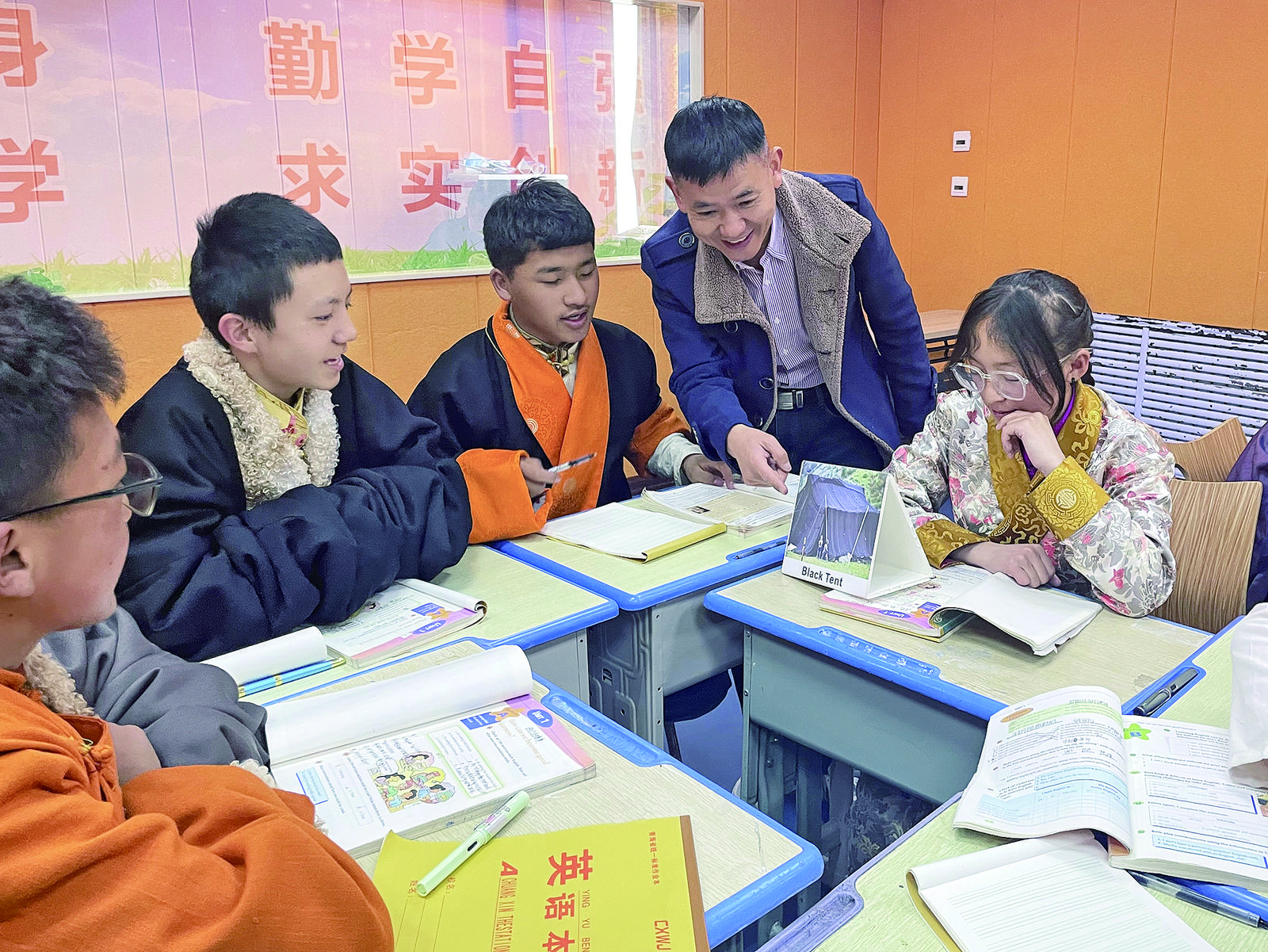 上海第五批援青團(tuán)隊(duì)成員,果洛州民族高級(jí)中學(xué)英語(yǔ)工作室主持人、高三教師芮學(xué)國(guó),為學(xué)生輔導(dǎo)英語(yǔ)課程。上海第五批援青團(tuán)隊(duì)供圖