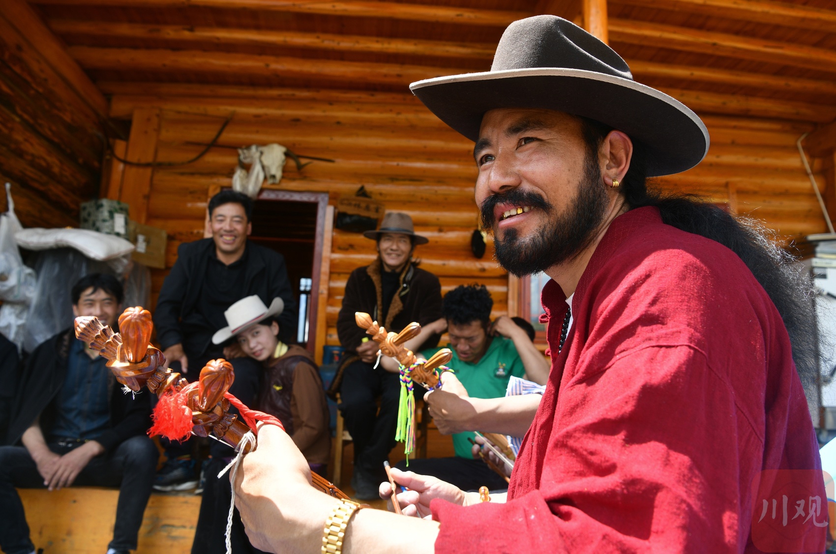 格木村村民在彈奏巴塘弦子。