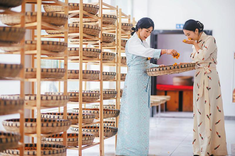 8月17日,阿壩州金川縣二嘎里鄉(xiāng)二嘎里村,返鄉(xiāng)創(chuàng)業(yè)青年侯正琴(左)與唐輝在晾曬雪菊。通過直播帶貨等多種形式,高原雪菊已成為該村的特色產(chǎn)業(yè)。何海洋 攝