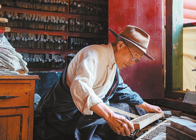 8月28日,甘孜州德格縣德格印經(jīng)院,69歲的彭措澤仁在校對修復(fù)雕版。作為德格印經(jīng)院藏族雕版印刷技藝的代表性傳承人,他已從事這項(xiàng)工作40余年。何海洋 攝
