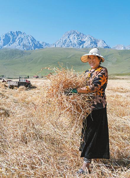 8月25日,甘孜縣仁果鄉(xiāng)有機(jī)青稞基地,聯(lián)合收割機(jī)完成收割后,德西青措將青稞秸稈打捆。今年她家的青稞再次增產(chǎn)。何海洋 攝