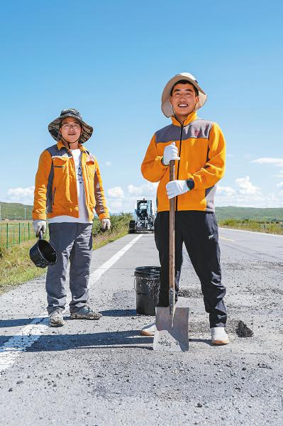 8月12日,24歲的尼瑪木滾(前)是阿壩州公路管理局刷經(jīng)寺公路管理分局的職工,2021年大學(xué)畢業(yè)后成為一名養(yǎng)路工。他與工作了17年的同事吳順杰一起,負(fù)責(zé)管護(hù)約40公里的國道。何海洋 攝