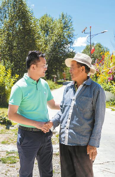 8月21日,甘孜州爐霍縣雅德鄉(xiāng)交納村“博士名譽(yù)村長”張藜山(左)與村民拉家常。自去年擔(dān)任“村長”以來,他致力于發(fā)展電商和旅游產(chǎn)業(yè),成為鄉(xiāng)村振興的“新引擎”。何海洋 攝