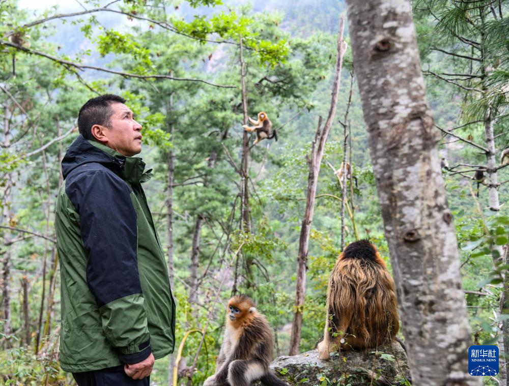 在四川白河國(guó)家級(jí)自然保護(hù)區(qū),唐玉林和川金絲猴互動(dòng)(10月11日攝)。新華社記者 王曦 攝