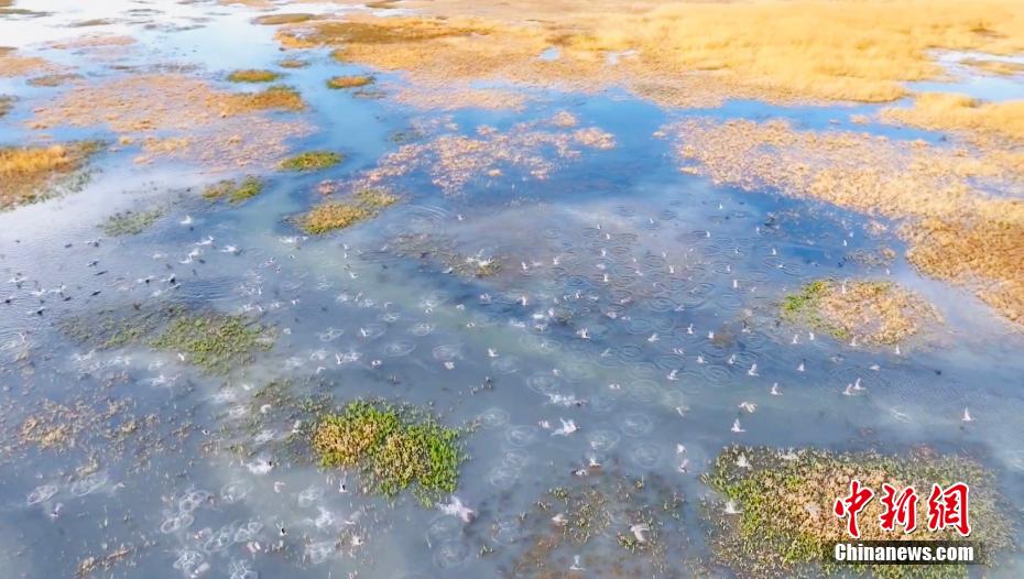 圖為無(wú)人機(jī)拍攝候鳥群在湖中飛舞。王小炯 攝