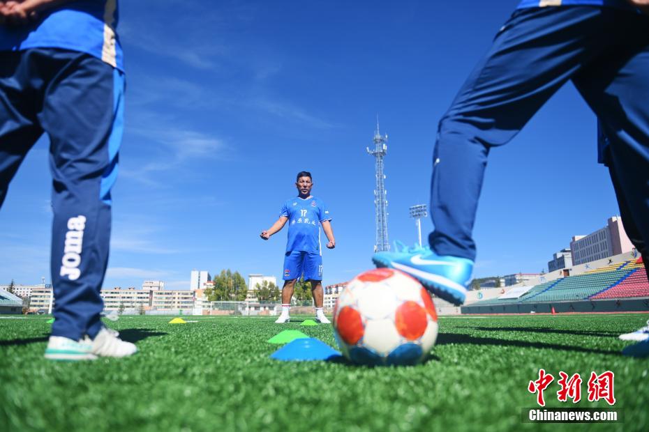 10月15日,在甘肅省甘南藏族自治州合作市一足球場內(nèi),甘南九二聯(lián)隊(duì)隊(duì)長久西道杰指導(dǎo)球員球技。