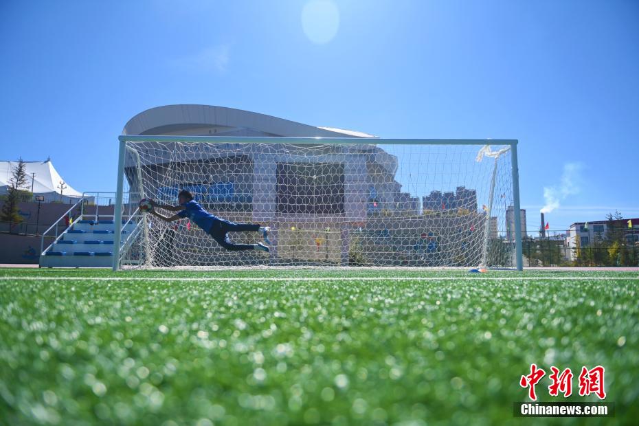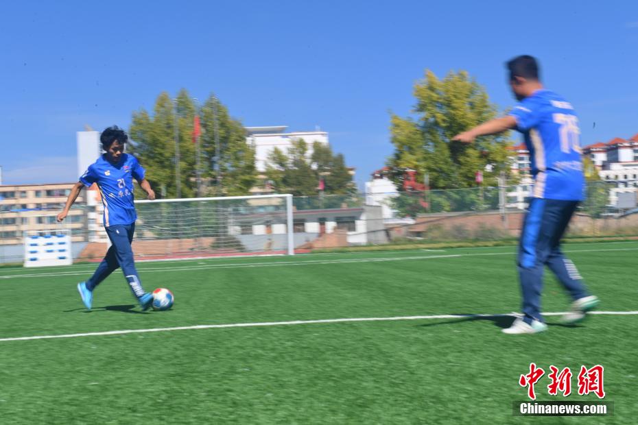 10月15日,在甘肅省甘南藏族自治州合作市一足球場內(nèi),甘南九二聯(lián)隊(duì)足球隊(duì)員進(jìn)行訓(xùn)練。