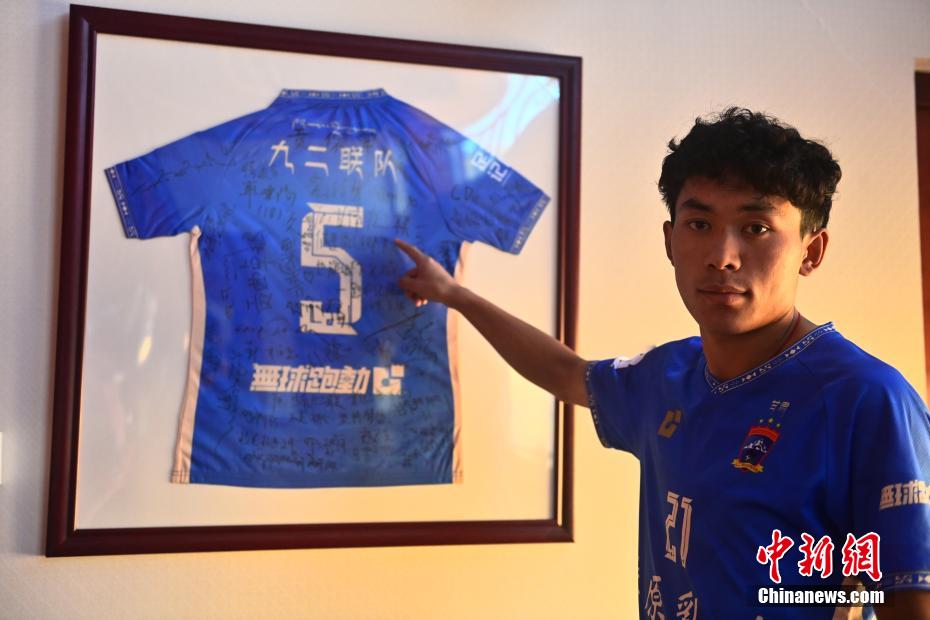 10月14日,在甘肅省甘南藏族自治州合作市甘南九二聯(lián)隊(duì)俱樂部榮譽(yù)展廳內(nèi),隊(duì)員更高才讓介紹該隊(duì)5號(hào)是中國足球協(xié)會(huì)杯第一個(gè)進(jìn)球的藏族球員。