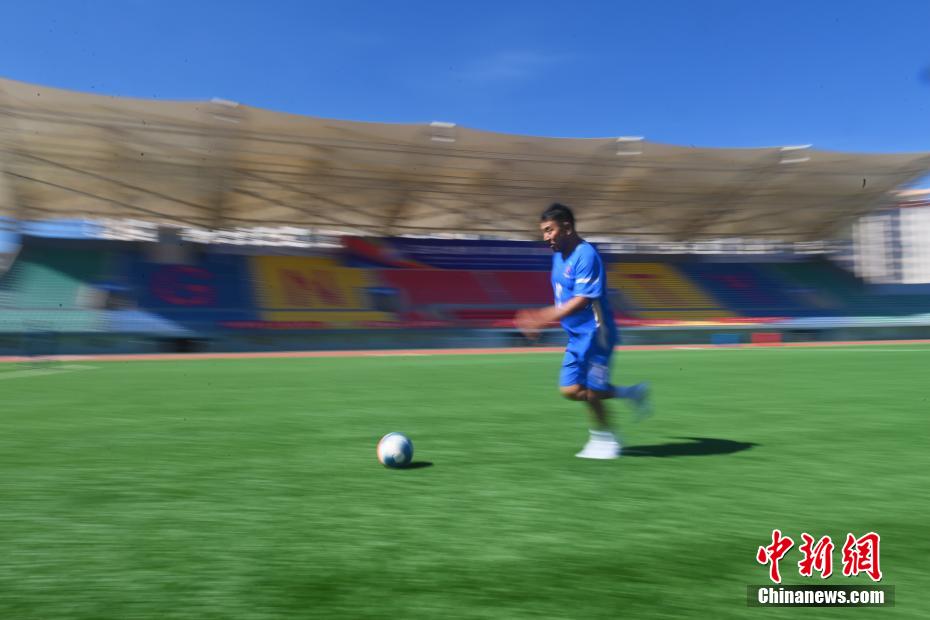 10月15日,在甘肅省甘南藏族自治州合作市一足球場內(nèi),隊(duì)員更高才讓(左)進(jìn)行訓(xùn)練。更高才讓是當(dāng)?shù)啬撩?,曾拿到甘肅省運(yùn)會(huì)足球賽最佳射手,他表示自己在足協(xié)杯用體力優(yōu)勢彌補(bǔ)了球技不足,因?yàn)榇饲霸谏钌侥羺^(qū)放牛坡度太陡無法騎馬只能徒步,所以每天近20公里的放牧生活造就了他的體力優(yōu)勢。