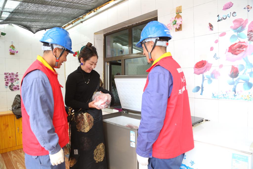 9月29日,通電后蘇里鄉(xiāng)牧民向供電服務人員展示冰箱冷凍過的肉。許小萍 攝