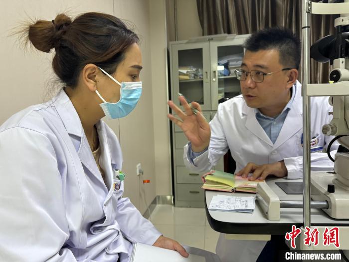 資料圖為顏繁誠(右)與玉樹州人民醫(yī)院眼科中心醫(yī)生交流。潘雨潔 攝
