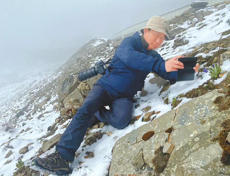 阿來(lái)在巴朗山拍花。四川日?qǐng)?bào)全媒體記者 肖姍姍 攝