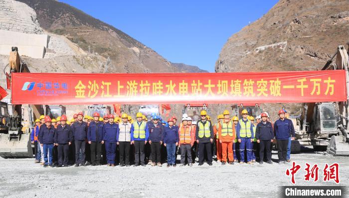 大壩填筑突破1000萬(wàn)立方米儀式現(xiàn)場(chǎng)。華電金上公司供圖