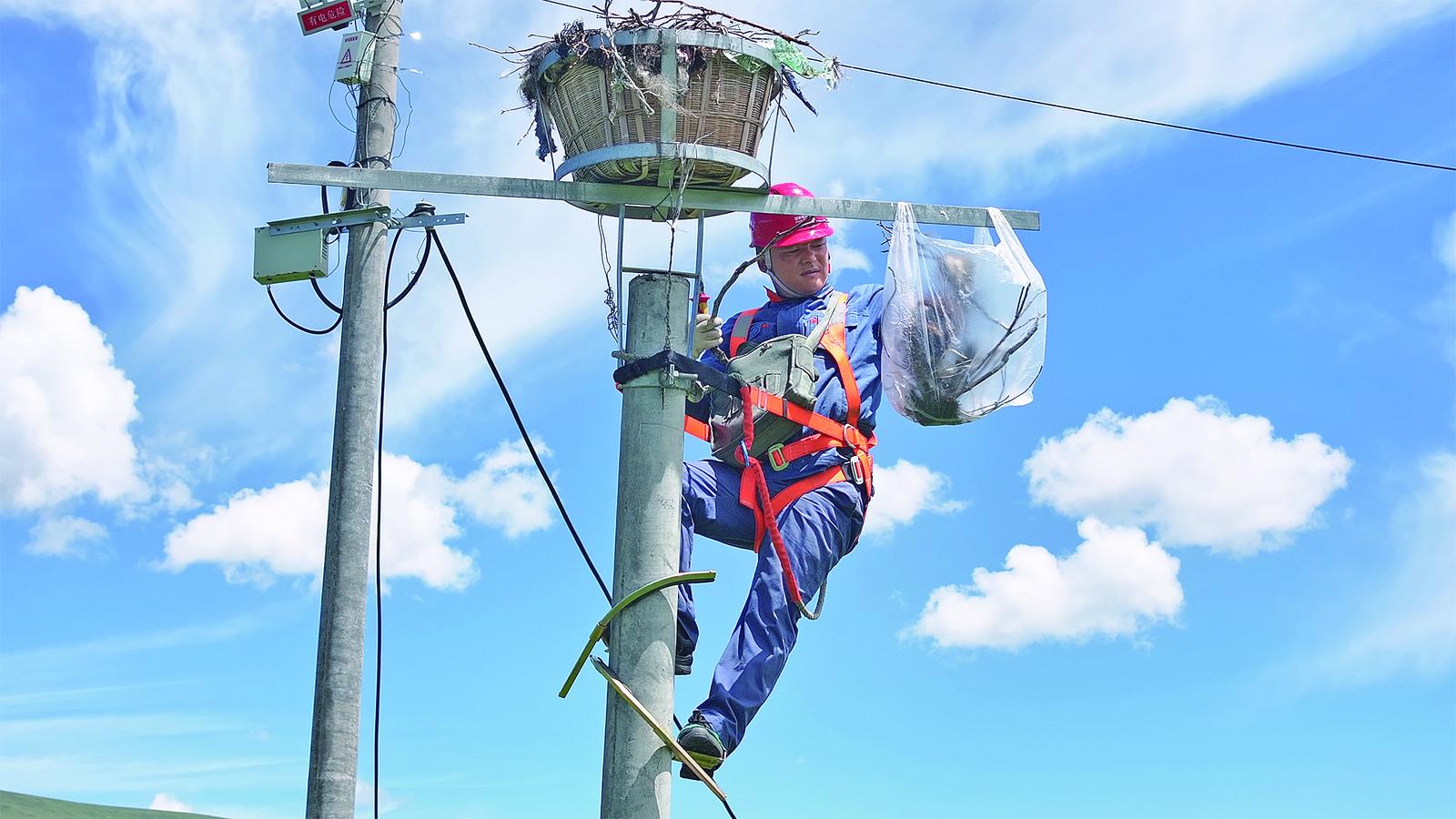 國(guó)網(wǎng)青海電力工作人員為“生命鳥(niǎo)巢”做好“物業(yè)服務(wù)”。張鵬 攝