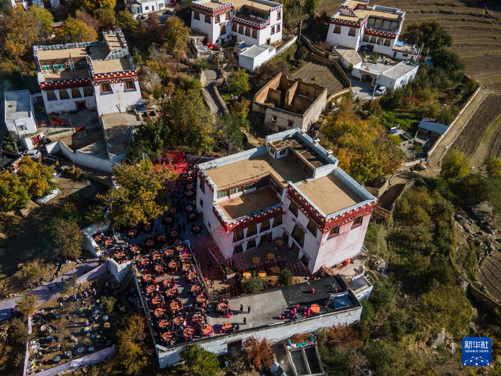 這是11月2日在仲德村拍攝的一場(chǎng)婚禮現(xiàn)場(chǎng)(無(wú)人機(jī)照片)。新華社記者 儲(chǔ)加音 攝