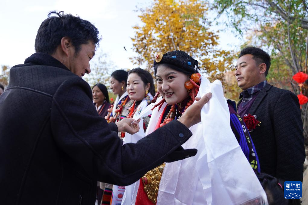 11月2日,在仲德村的一場(chǎng)婚禮上,新娘羅絨扎姆(右二)接受客人的哈達(dá)祝福。新華社記者 胥冰潔 攝
