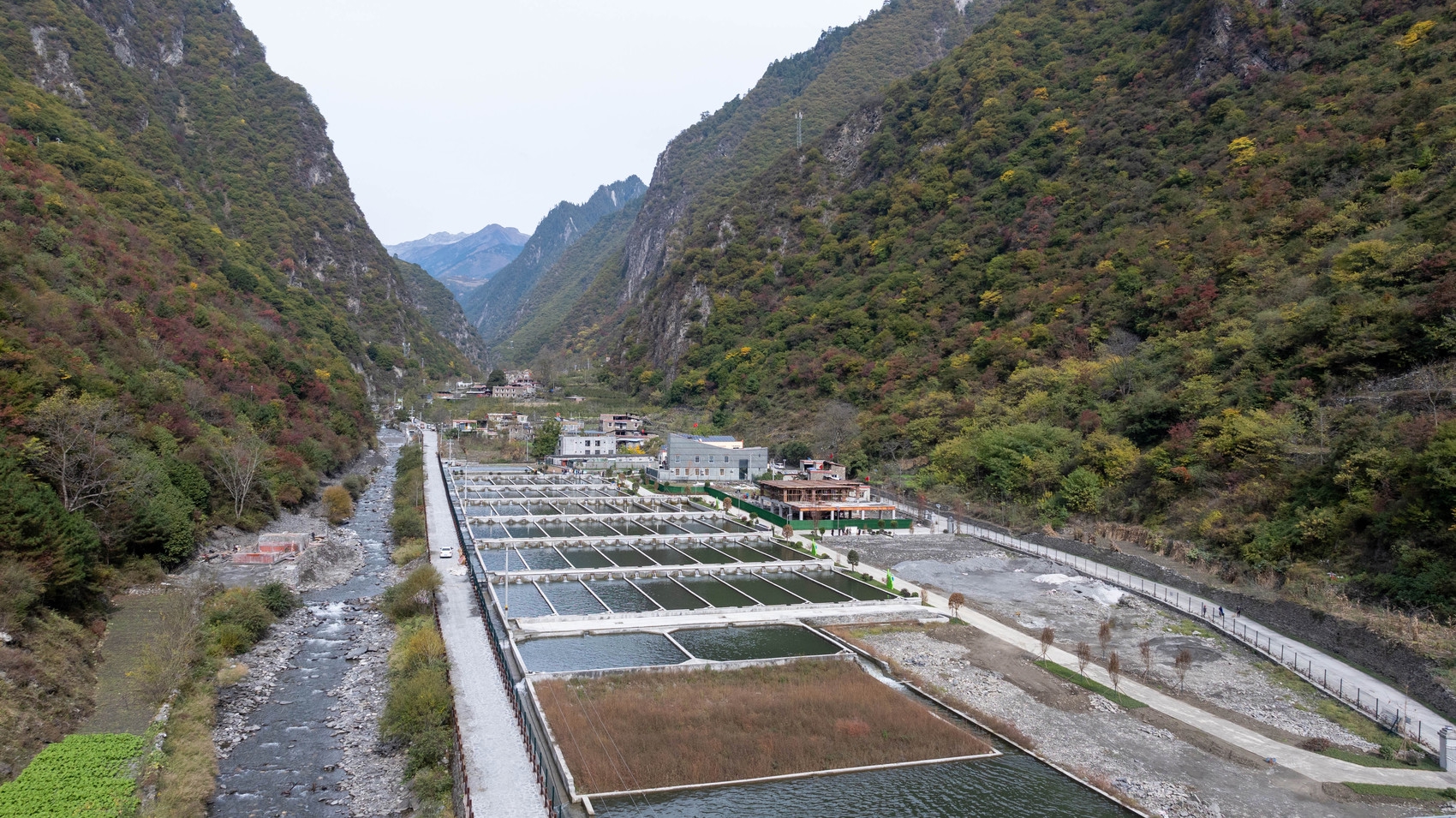 50個(gè)長(zhǎng)方形養(yǎng)殖池依次排列,清澈的冷泉水在其中潺潺流動(dòng),不時(shí)有魚(yú)兒躍出水面。11月7日一早,“萬(wàn)千氣象看四川”四季度集中采訪活動(dòng)報(bào)道組來(lái)到理縣薛城鎮(zhèn)甲米村,在海拔2000米的地方,見(jiàn)到了初具規(guī)模的高原特色冷水魚(yú)產(chǎn)業(yè)基地,這也是阿壩州第一家規(guī)?;渌~(yú)養(yǎng)殖基地。