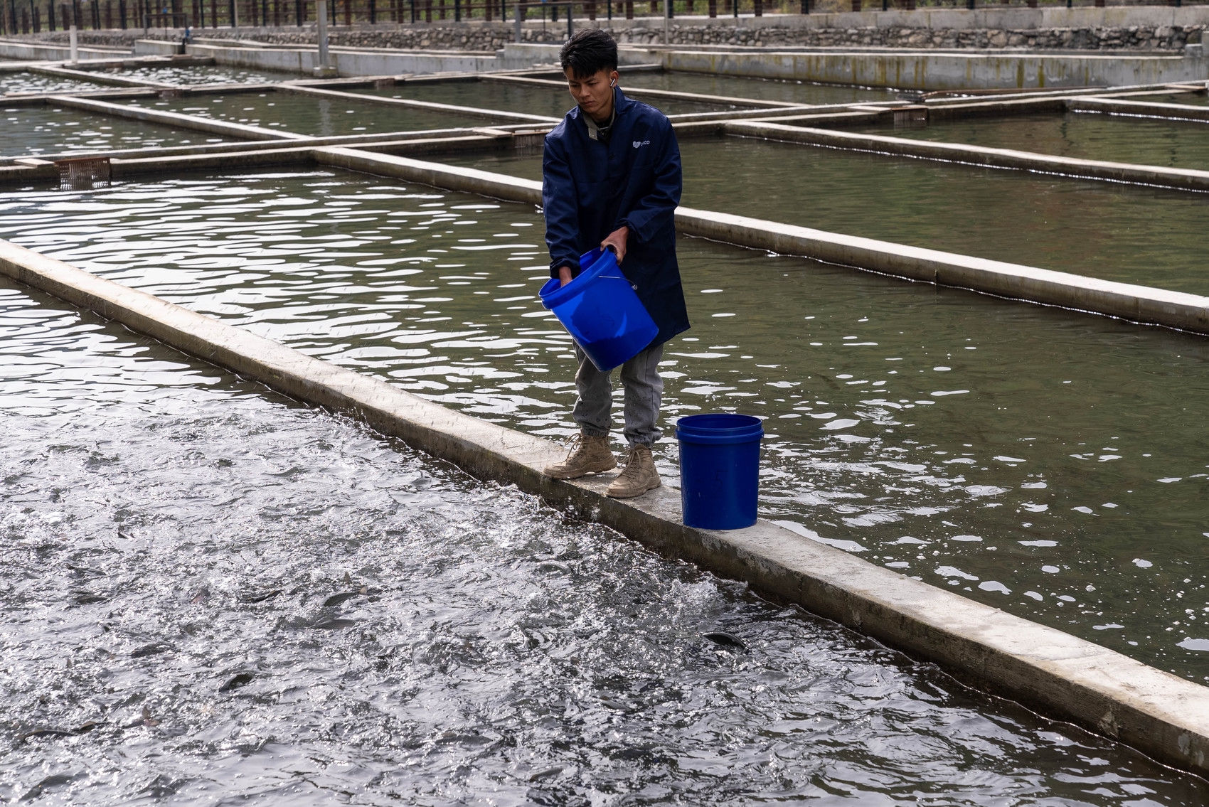 工作人員喂食冷水魚(yú)。
