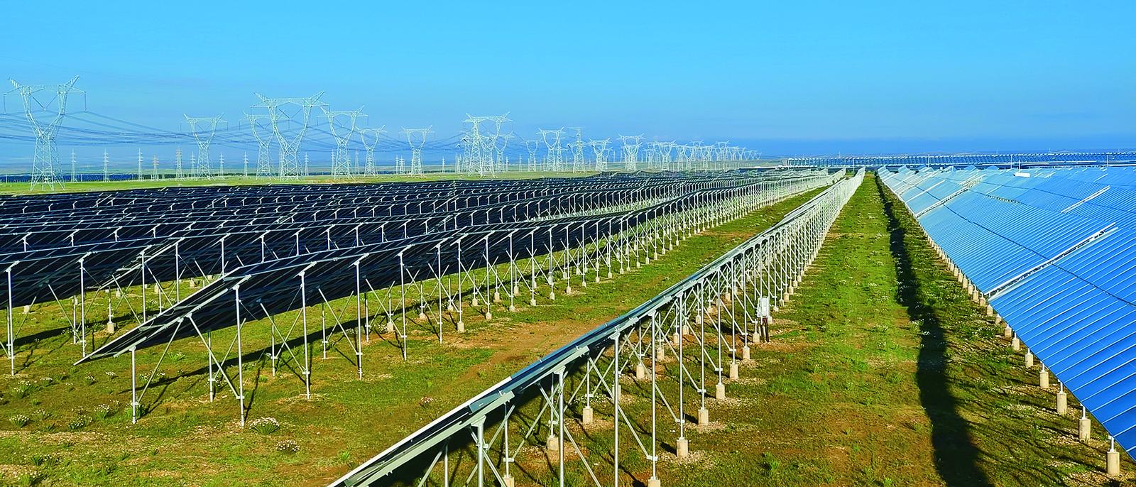 當(dāng)光伏與黃沙相遇,變身成為科技感十足的“藍(lán)?!睍r(shí),第一重生態(tài)效益初步顯現(xiàn)。