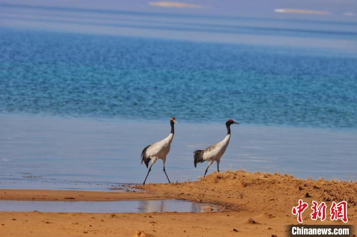 圖為黑頸鶴在青海湖畔休閑漫步。青海湖景區(qū)保護利用管理局供圖