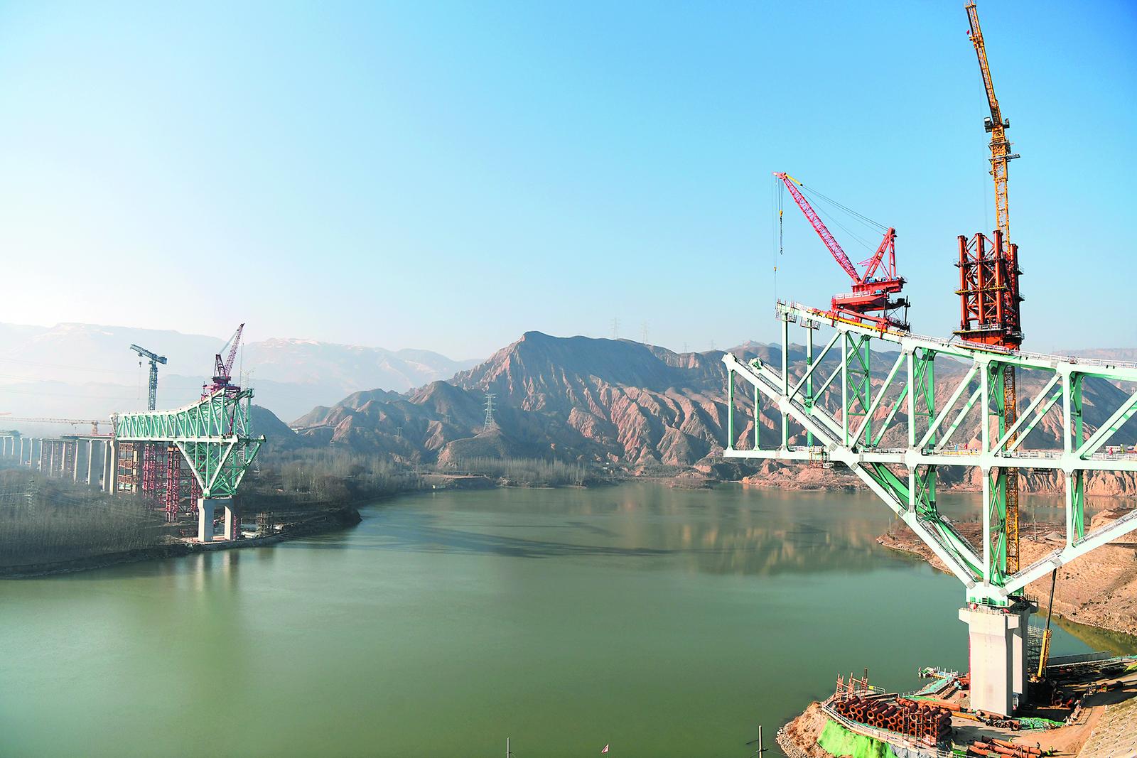 正在建設(shè)中的尖扎黃河特大橋。李慶玲 王玉瑩 潘昊 攝