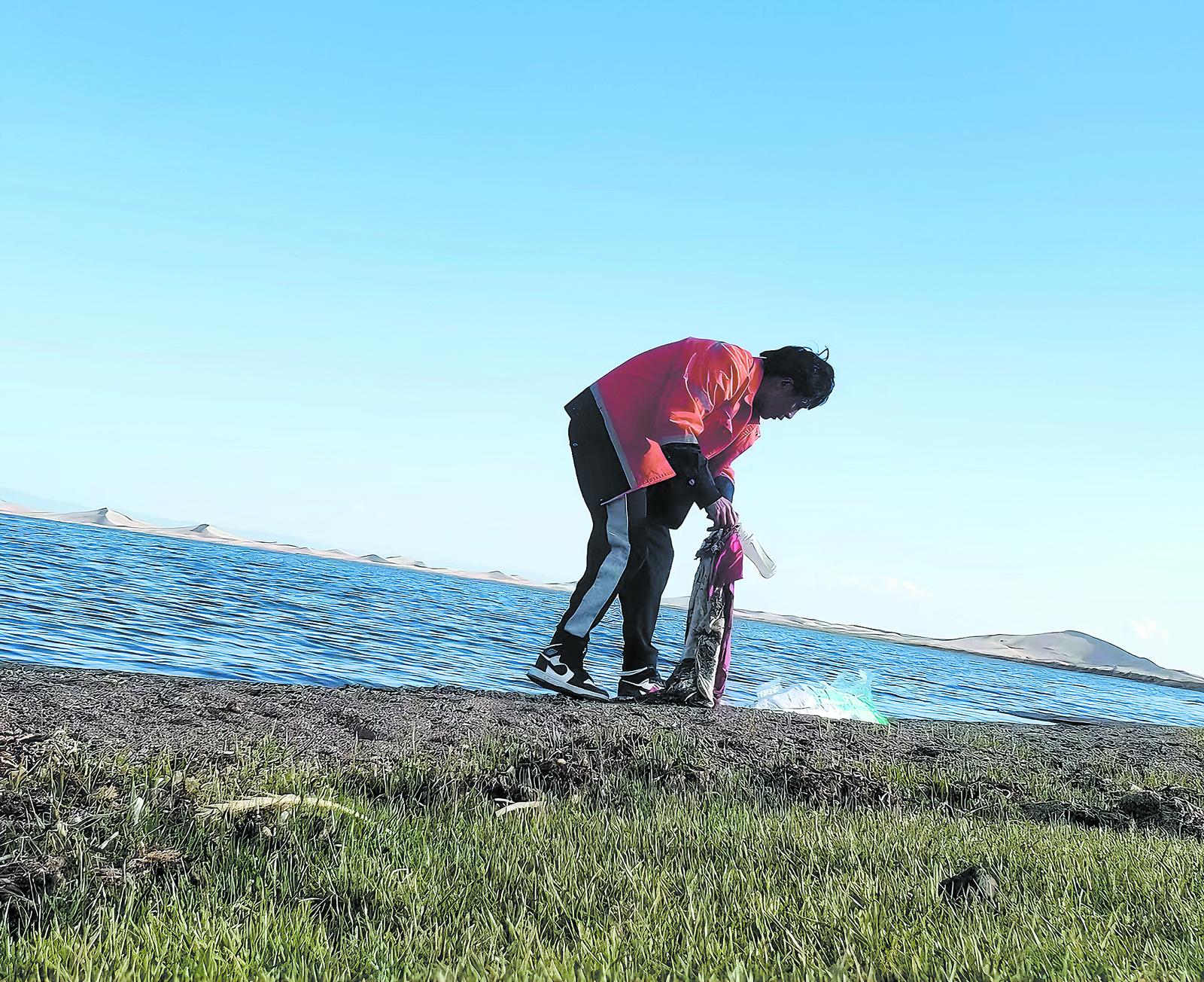 甘子河鄉(xiāng)熱水村生態(tài)員桑日杰東智布,剛參加完村里的會(huì)議,就往他負(fù)責(zé)的巡護(hù)區(qū)域走去。他的區(qū)域靠近青海湖邊,他邊走邊拿著袋子將見(jiàn)到的垃圾撿起,等返回來(lái)的時(shí)候再撿一遍。