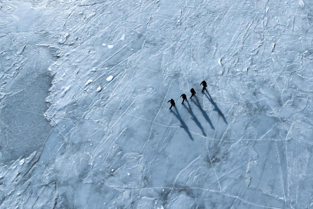 1月9日,剛察縣青海湖派出所民警在巡護(hù)青海湖(無人機(jī)照片)。新華社記者 張龍 攝