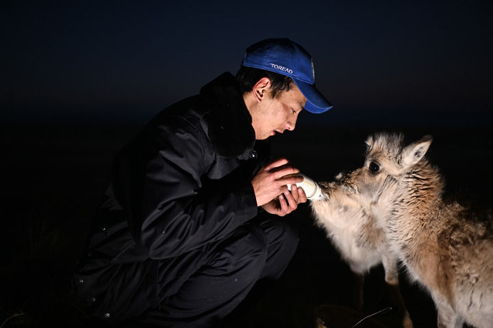 可可西里巡山隊隊員才文多杰在索南達(dá)杰保護(hù)站內(nèi)給被救助的藏羚羊幼仔喂奶(2024年1月18日攝)。新華社記者 張宏祥 攝