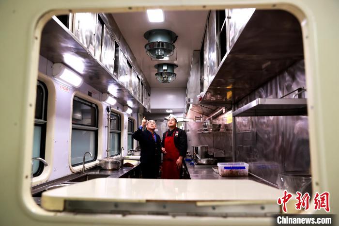 圖為郝寶君和餐車工作人員查看餐車設(shè)備運(yùn)行情況。薛蒂 攝