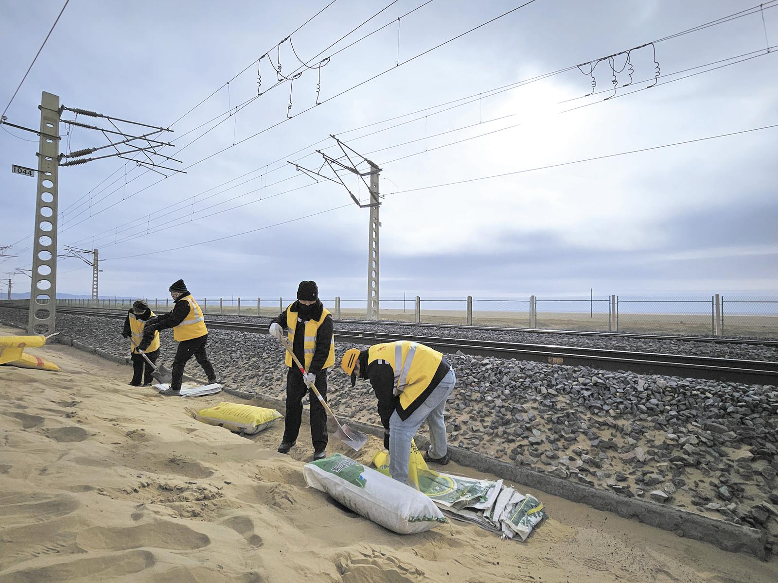 多年來,工區(qū)職工們反復(fù)探索,積累經(jīng)驗(yàn),采用“草方格”“石方格”“擋沙墻”“HDPE低立式防沙板”等一系列防沙治理措施,有效固定了流沙。但風(fēng)不停息沙不止,風(fēng)沙依舊不時侵入線路。