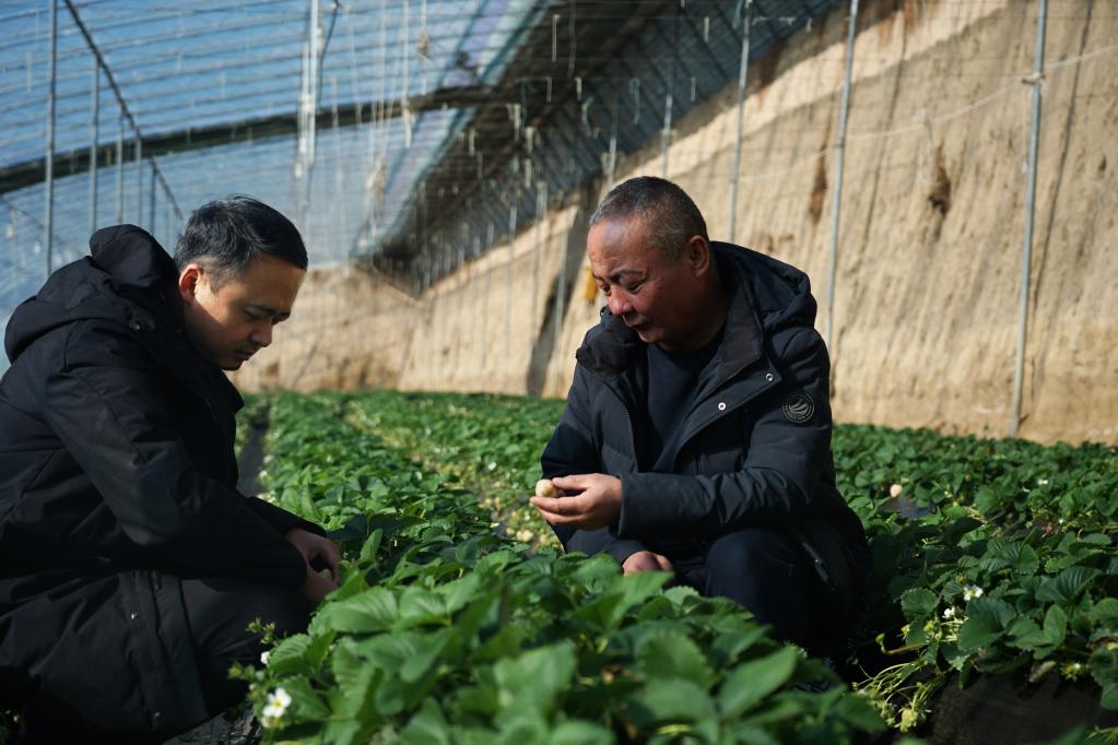 1月17日,張志偉(右)與楊世鵬交流草莓種植情況。新華社記者 陳杰 攝